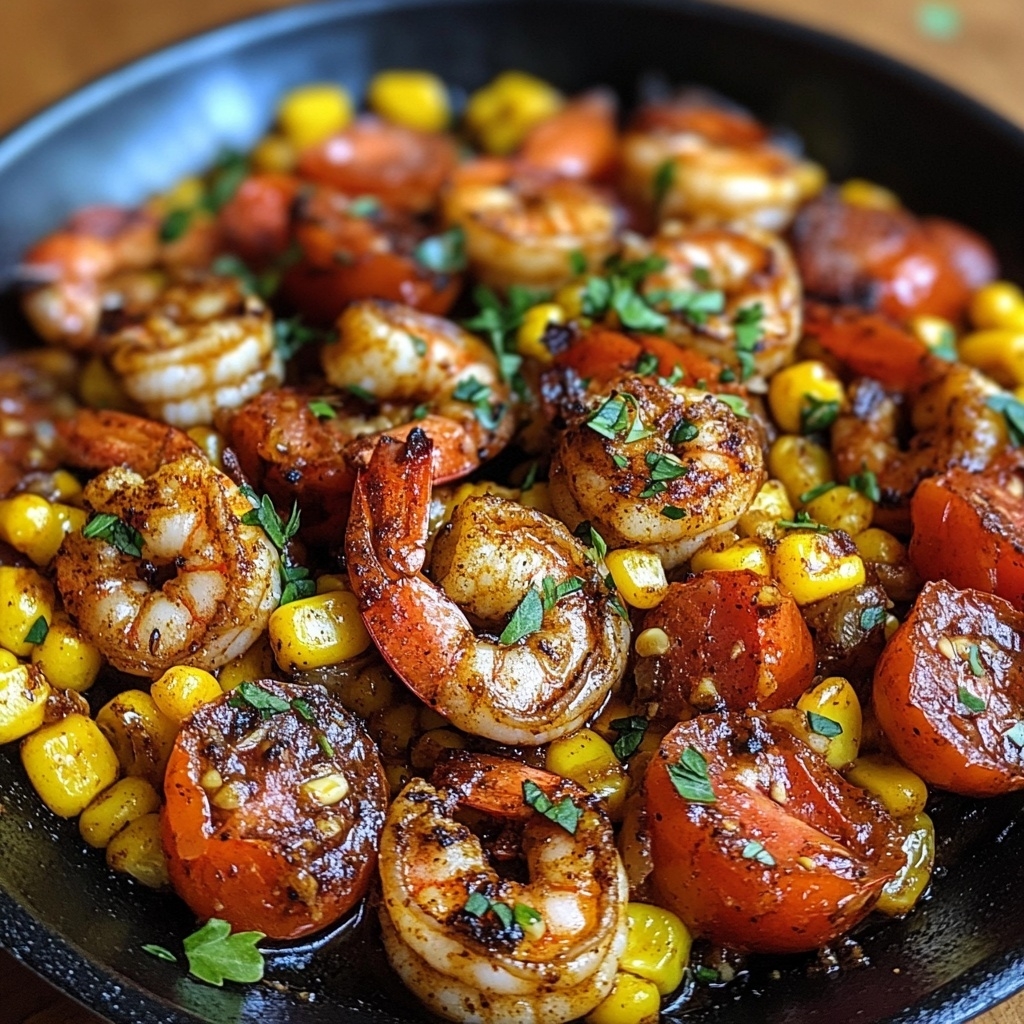 - Return the shrimp to the skillet, tossing gently with the tomatoes and corn.