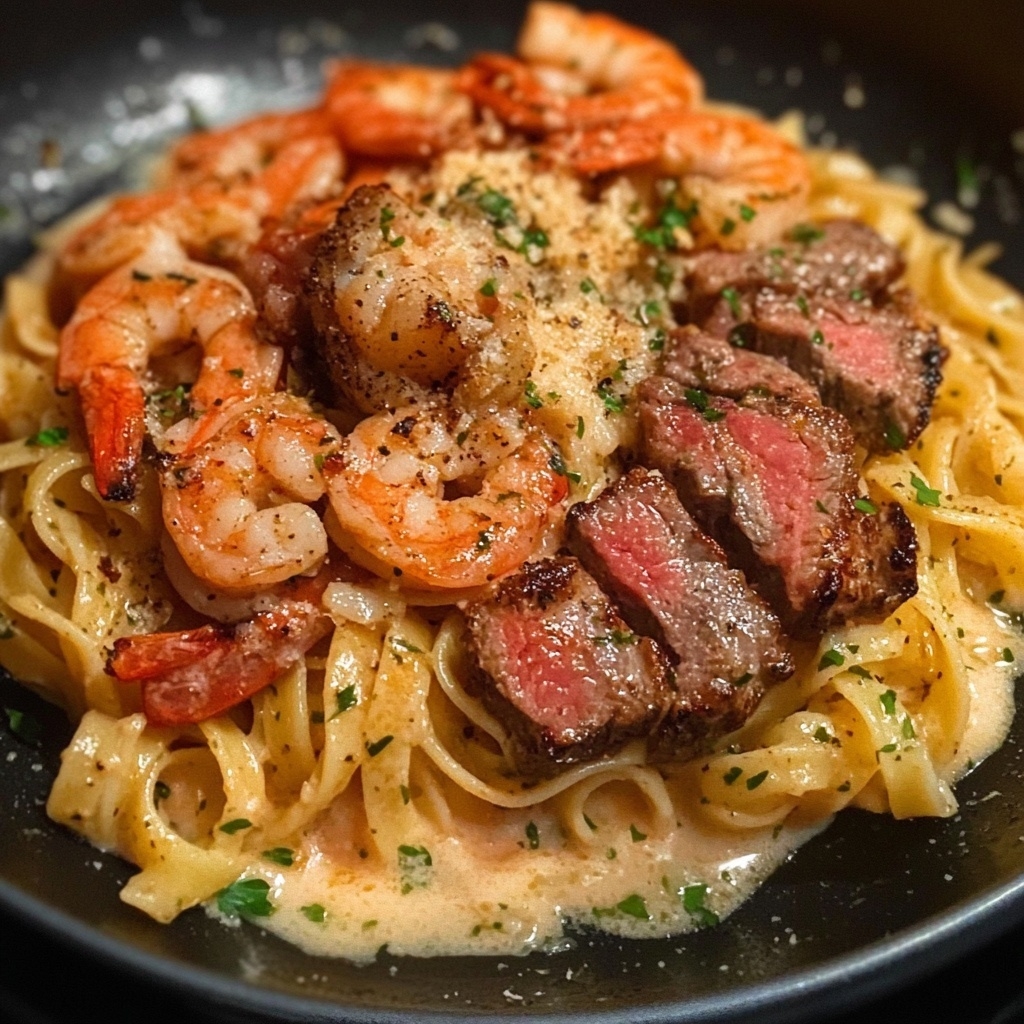 This Surf and Turf Pasta recipe brings together the luxurious flavors of land and sea in one unforgettable dish. The creamy garlic sauce, tender steak, and succulent shrimp create a harmonious combination that feels indulgent yet balanced.